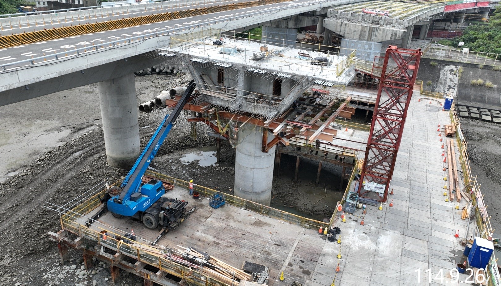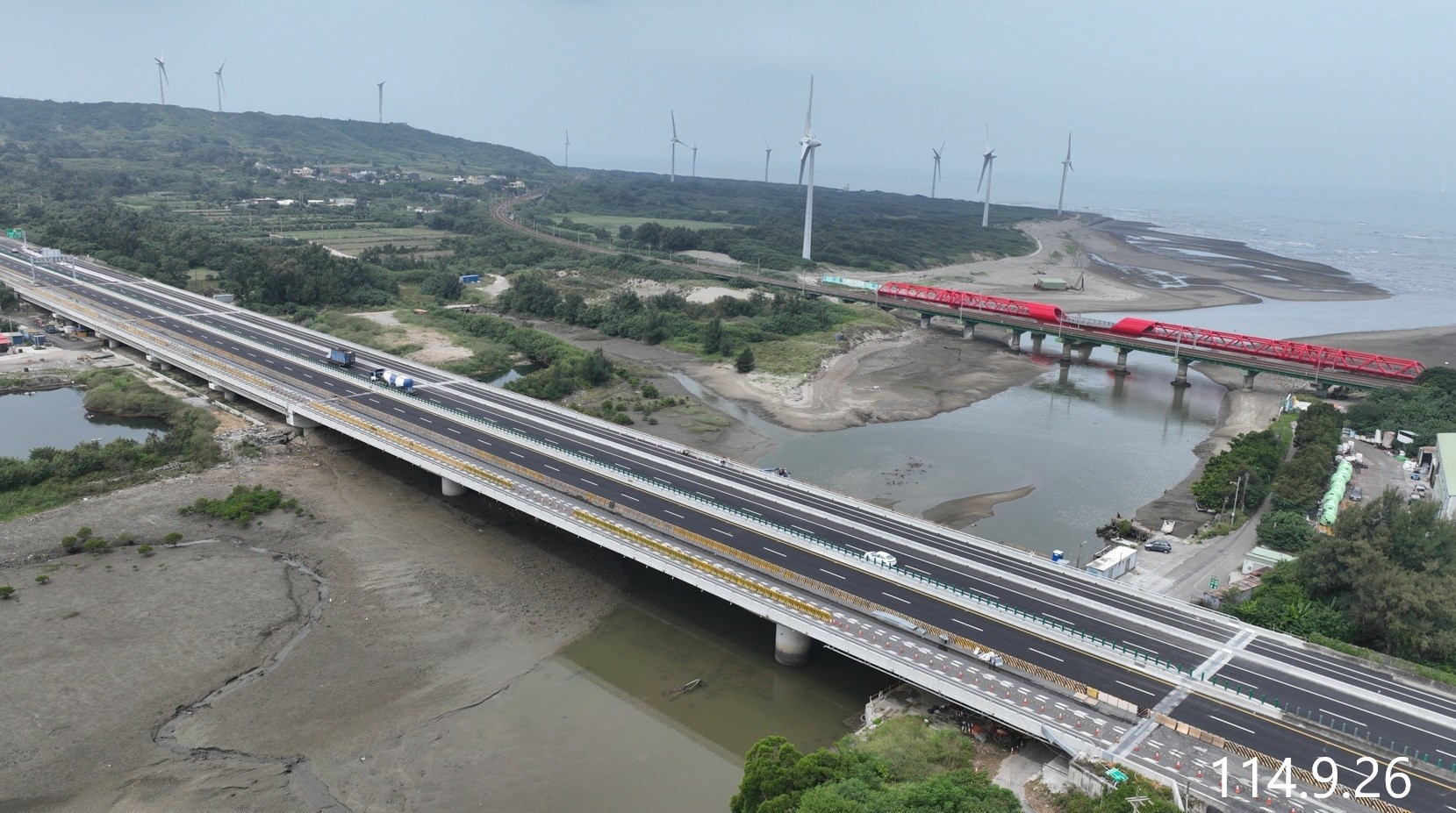 - 目前施作:後龍觀海大橋南下線P13'-2懸臂節塊及P14'柱頭節塊施作、後龍觀海大橋南下線P15'墩柱施作、後龍觀海大橋南下線P16'柱頭節塊施作、後龍觀海大橋南下線S25橋面板施作、西湖溪橋第3階段交維改道切換、西湖溪橋橋下混凝土內面工排水溝施作等工項。