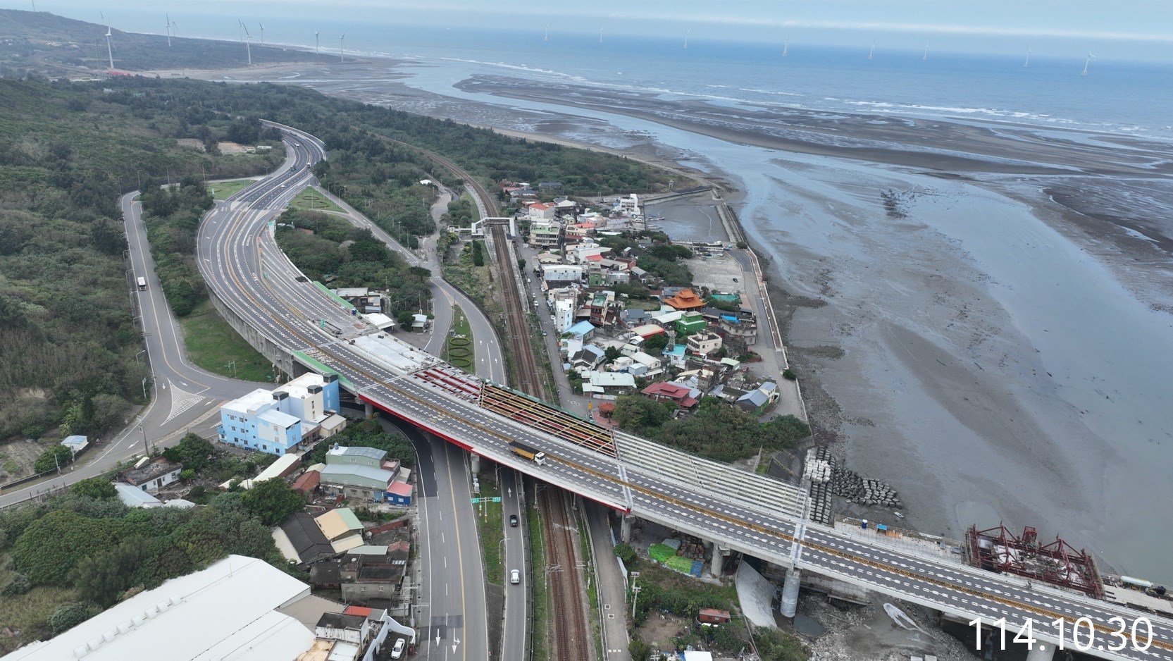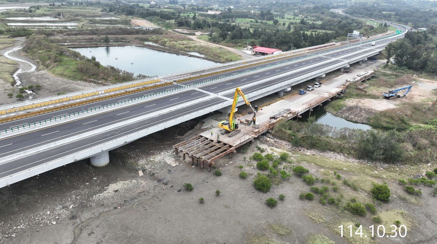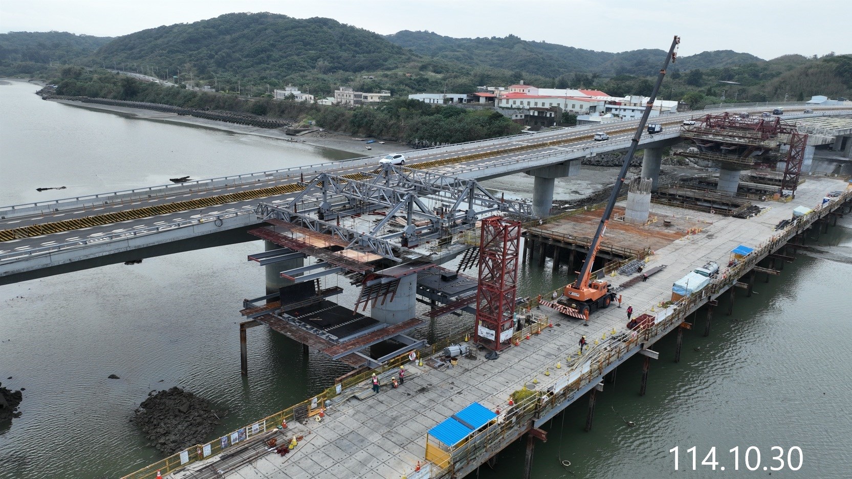 - 目前施作:後龍觀海大橋南下線P13'-5懸臂節塊施作、後龍觀海大橋南下線P14'懸臂工作車組裝、後龍觀海大橋南下線P15'場撐邊跨施工構台打設、後龍觀海大橋南下線P16'-2懸臂節塊施作、後龍觀海大橋南下線S24橋面板施作、西湖溪橋北上線快慢分隔護欄復舊作業、西湖溪橋南下線施工便橋拆除等工項。